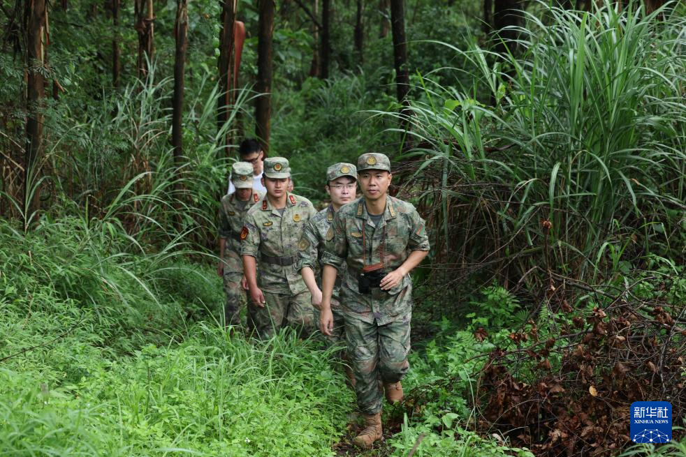 广西军区某部谢亮(前一)组织军地人员联合勘察(资料照片)。 新华社发(梁凯昌摄)