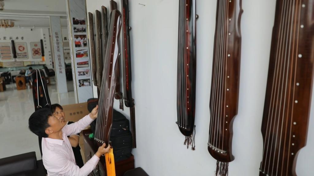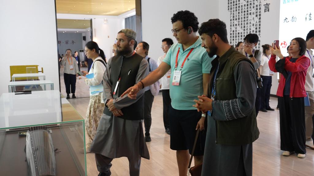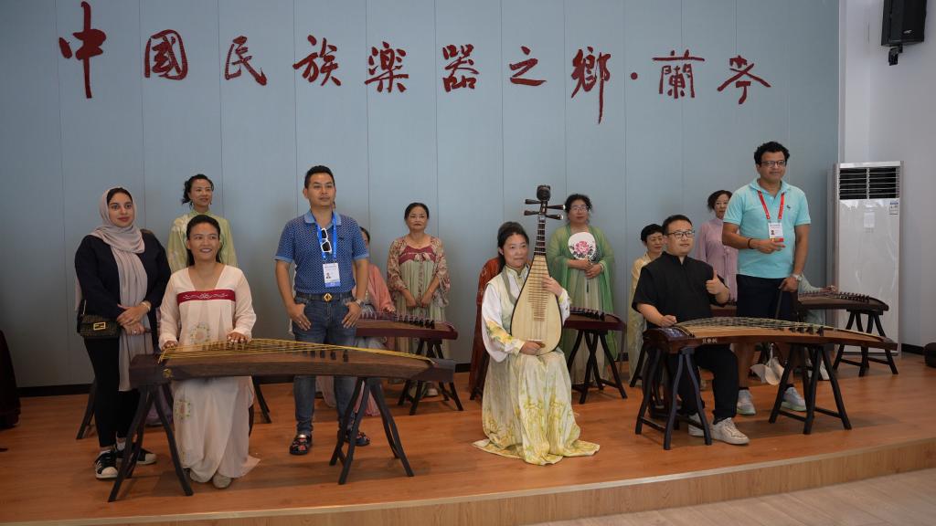 7月26日,新华社记者跟随参加上合组织媒体智库峰会的外国嘉宾们来到河南省开封市兰考县堌阳音乐小镇参观访问。现场展示的一件件中国传统民族乐器吸引了嘉宾们的目光。