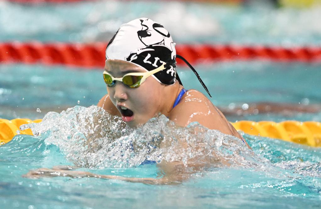 ↑2024年9月28日,于子迪在2024年全国游泳锦标赛(25米)女子400米个人混合泳决赛中。新华社记者 程敏 摄