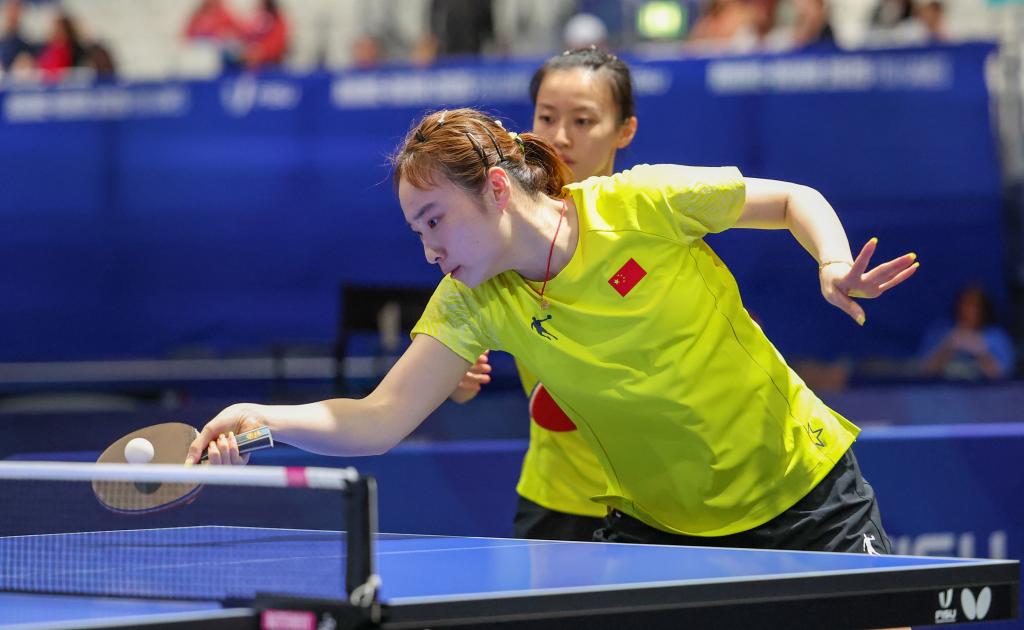 7月23日,中国组合韩菲儿/王晓彤(前)在乒乓球女双决赛中。新华社记者 张帆 摄