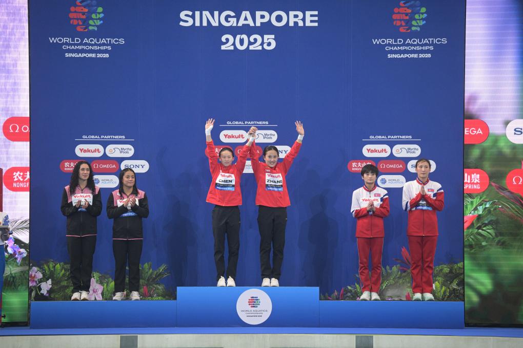 7月28日,陈芋汐(左三)/掌敏洁(右三)在颁奖仪式上。新华社发(邓智炜摄)