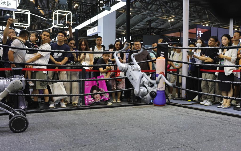 在宇树科技展位,两台身高1.32米、重35公斤的宇树科技G1格斗机器人上演格斗赛,直拳、躲闪、回旋踢,机器人颇有职业格斗运动员的风采。