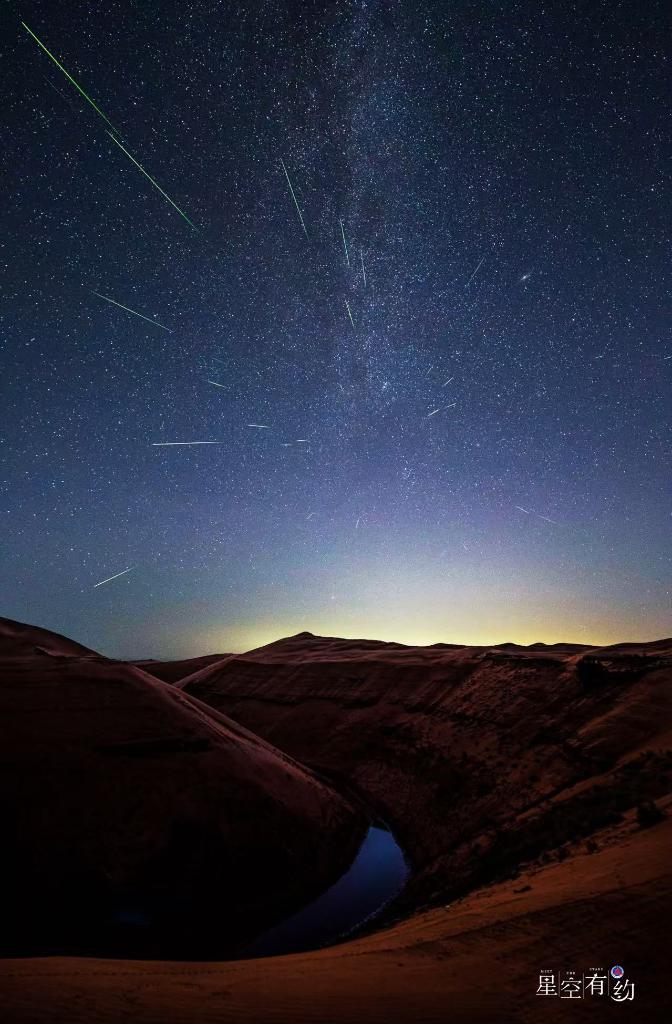 2020年8月13日,在内蒙古自治区鄂尔多斯市库布齐沙漠拍摄的英仙座流星雨(多张叠加)。(王晋 摄)