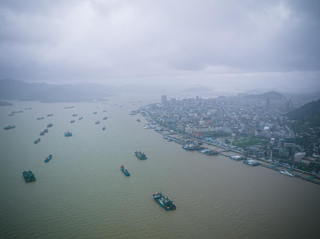 进入象山县石浦渔港,天边云层渐压,雨势不断加强,雨点密集地砸在车辆的挡风玻璃上,已明显感受到台风外围云系带来的疾风骤雨。