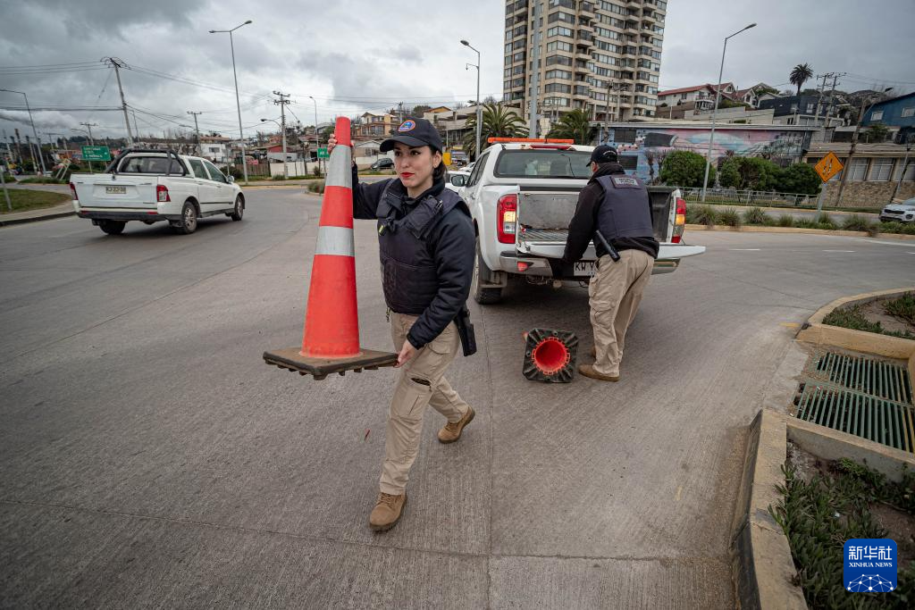 7月30日,在智利瓦尔帕莱索大区康孔市,警察设置道路疏散引导标志。新华社发