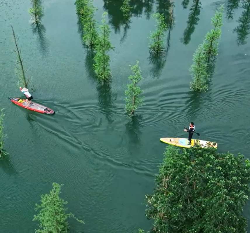 在重庆武隆的芙蓉江上,一处“水上森林”景观如同风景画一般美丽。入夏以来,“水上森林”成为桨板运动爱好者喜爱的打卡点。