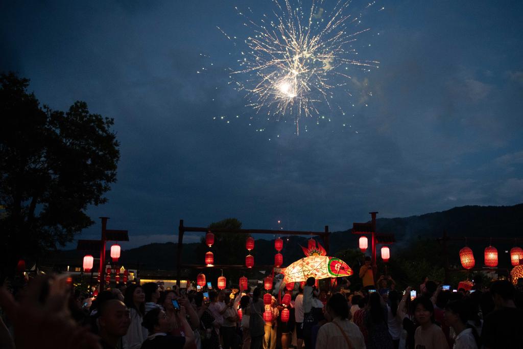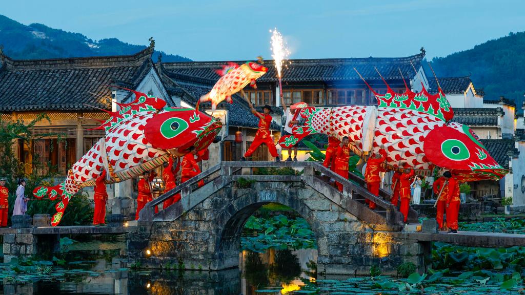 7月25日,在安徽省黄山市徽州区呈坎村,非遗鱼灯巡游活动吸引游客前来观赏。新华社记者 张端 摄