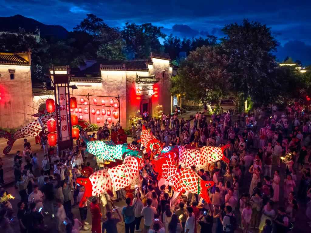 7月25日,在安徽省黄山市徽州区呈坎村,非遗鱼灯巡游活动吸引了游客前来观赏(无人机照片)。新华社发(樊成柱 摄)
