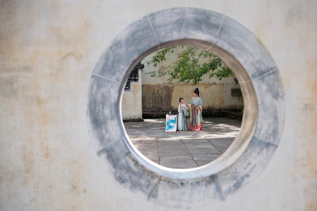 7月25日,游客在安徽省黄山市徽州区呈坎村游玩。新华社记者 张端 摄
