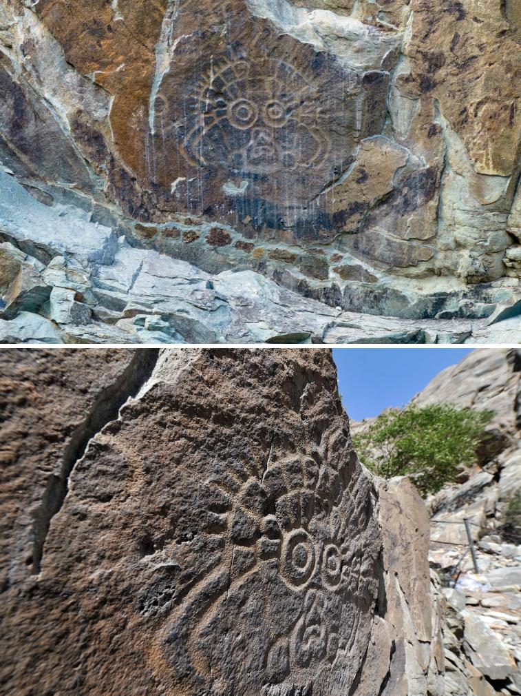 拼版照片,上图为2025年7月23日拍摄的岩画“太阳神”;下图为2013年5月10日拍摄的岩画“太阳神”。经过灌浆加固,“太阳神”岩画如今保存状态良好。新华社发