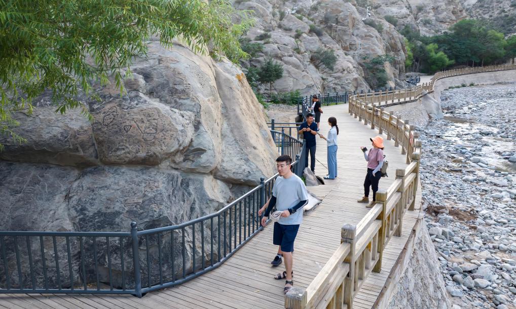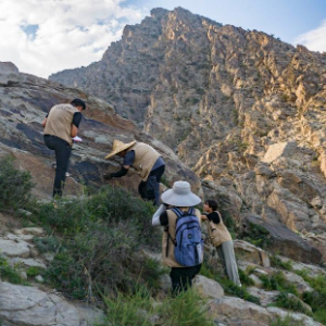 工作人员在贺兰山岩画遗址区内进行2025年度岩画复查。新华社发