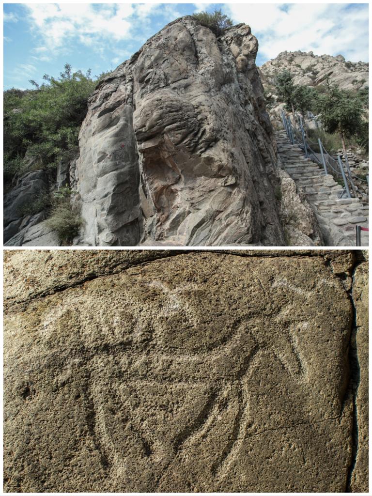 拼版照片。上图为刻有“驴羊图”的山体,岩画图案在夹角沟壑中;下图为“驴羊图”岩画。新华社发