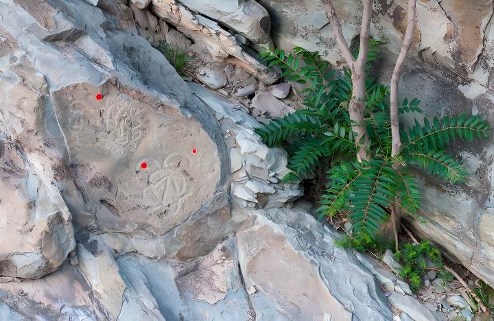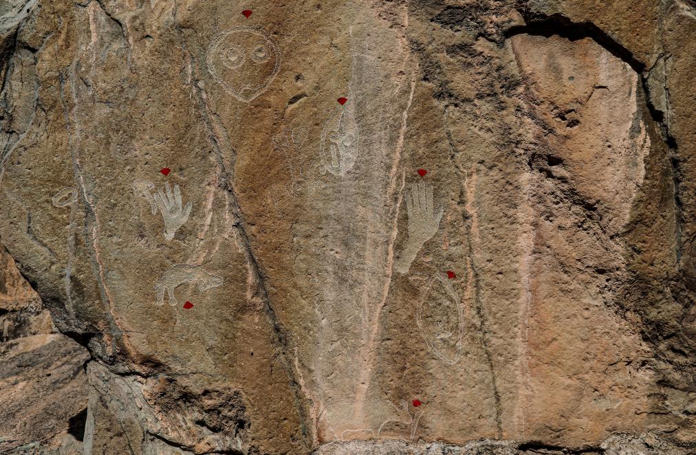 这是在贺兰山岩画景区拍摄的岩画和红色标识点。标识点方便游客找到岩画,可以随时粘贴,对石质和文物不会产生影响。新华社发
