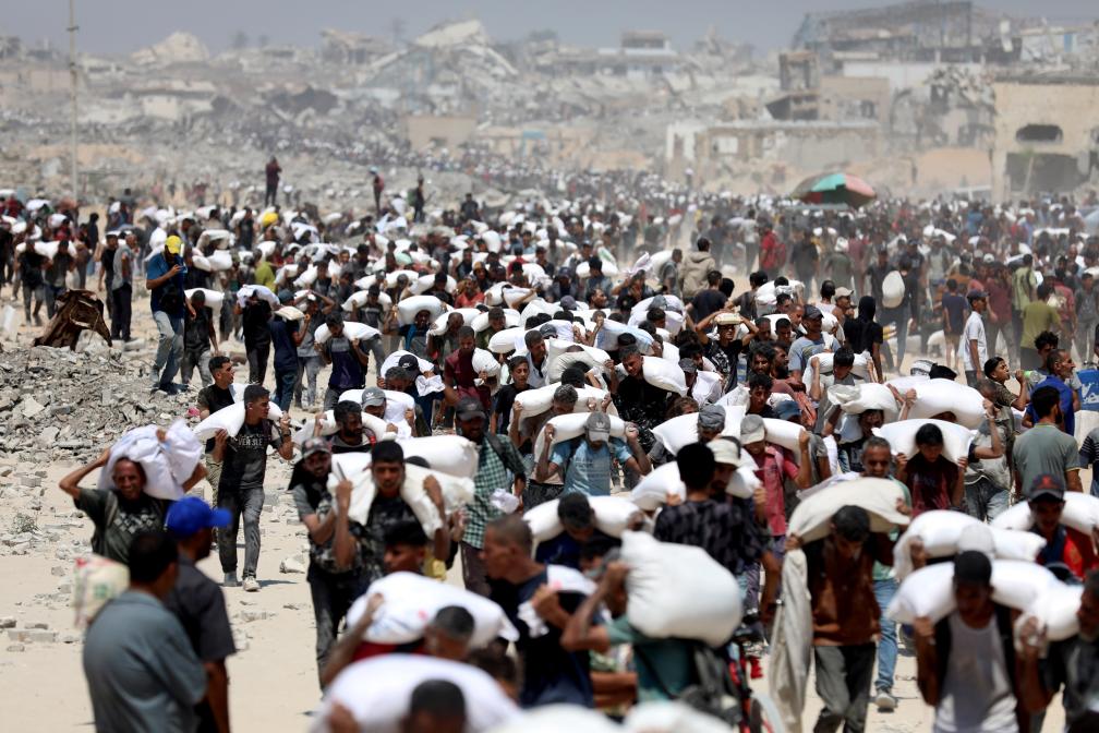 7月27日,在加沙地带北部城镇拜特拉希亚,人们领取通过边境口岸进入加沙的援助物资。新华社发(里泽克·阿卜杜勒贾瓦德摄)