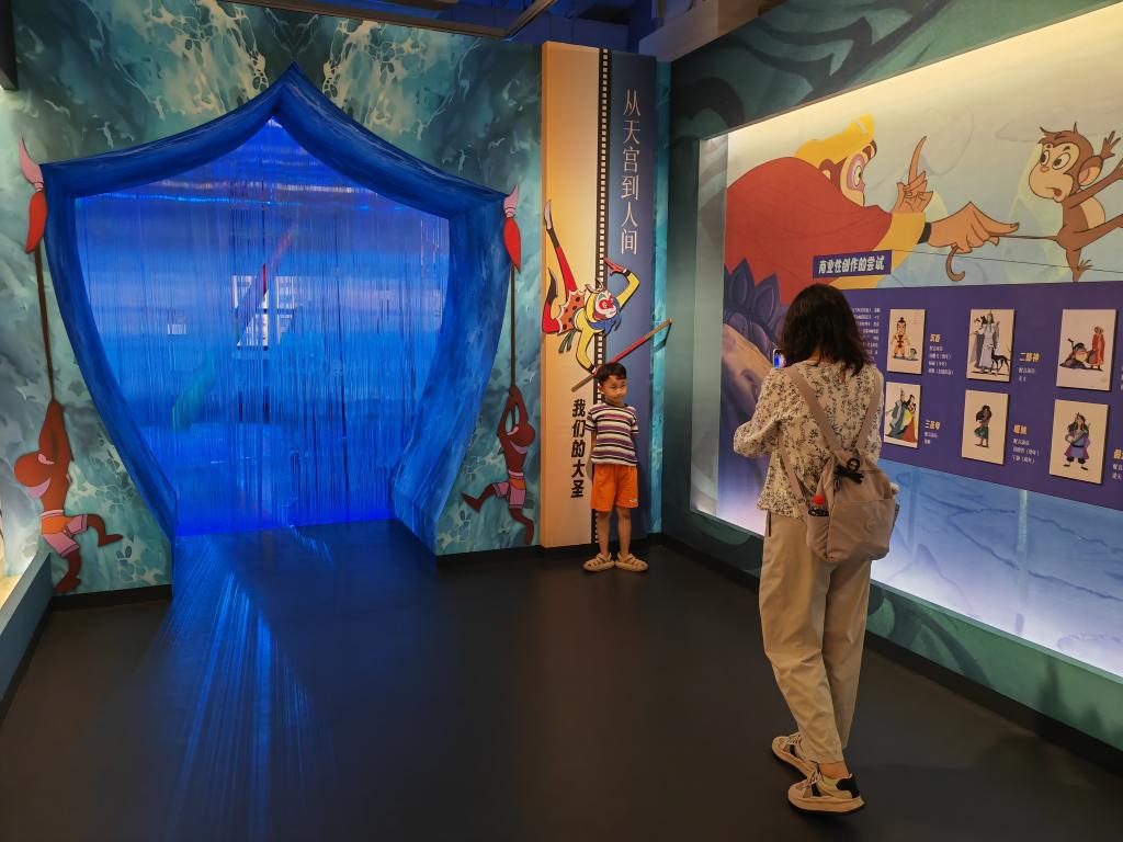 “原来孙悟空有这么多形象,除了电视剧《西游记》,动画片里还可以看到造型不同的齐天大圣,既有戏曲脸谱的夸张,又不失漫画的灵动,太好看了。”学生黄豆豆一边说着,一边与巨型金箍棒合影。在展览的“大圣空间”内,展出了8部有孙悟空角色的动画藏品,观众可以了解动画的制作场景和创作者的心路历程。