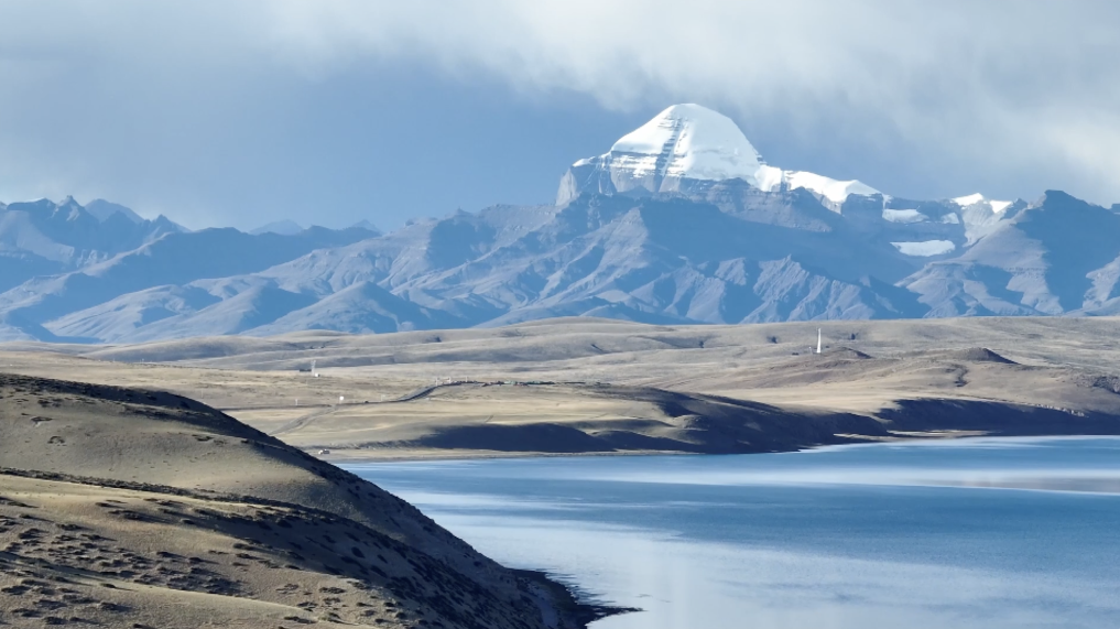 玛旁雍错湖畔远眺,冈仁波齐静立天际。新华社记者 黄智琪 摄