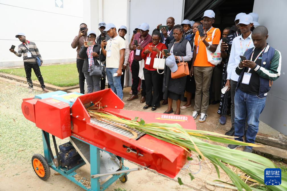 7月17日,在位于卢旺达南方省胡耶区的中国援卢农业技术示范中心,学员们观看菌草粉碎。新华社发(黄万晴摄)