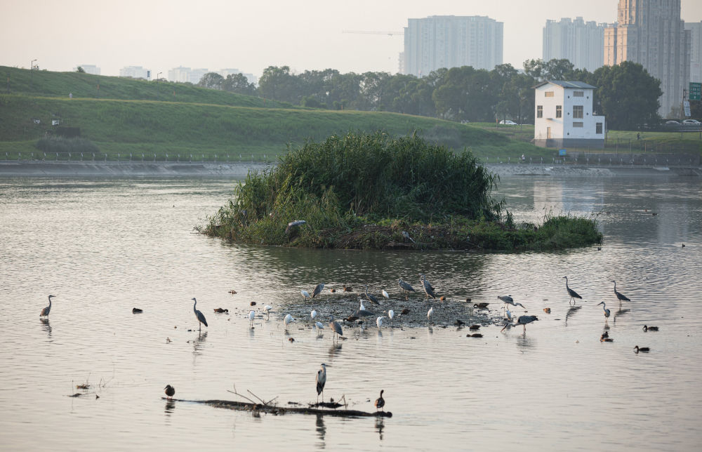 ↑在成都市锦江高新区段,众多水鸟栖息在生态鸟岛上(2023年7月18日摄)。新华社记者 江宏景 摄