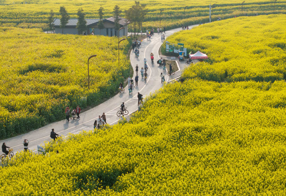↑在成都市高新区石羊街道三元社区的油菜花田,市民沿着绿道骑车、散步、赏花(2025年3月13日摄,无人机照片)。新华社记者 江宏景 摄