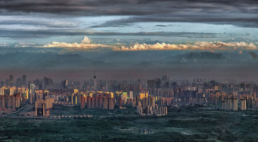 ↑在成都市龙泉山上远眺,晨晖照亮雪山和主城区(2025年6月30日摄)。新华社发(谢小明摄)