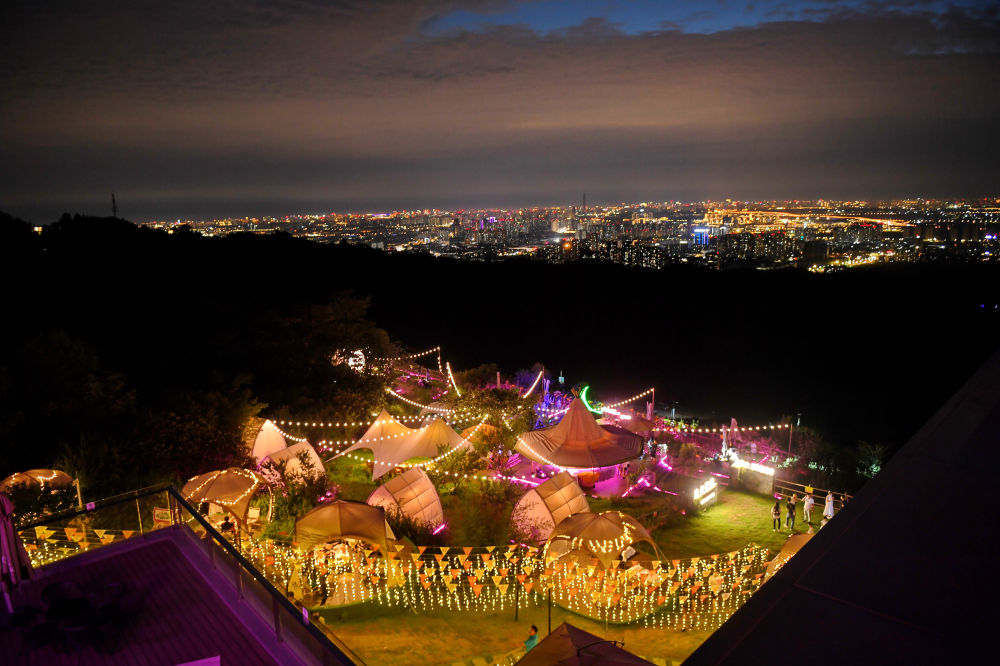 ↑成都市龙泉驿区龙泉山顶观景台附近灯火通明,顾客这里避暑消夜(2025年7月5日)。新华社 发(李向雨 摄)