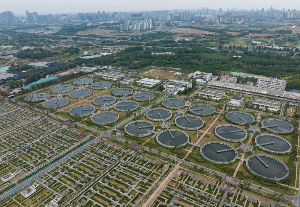 ↑这是成都市第九再生水厂,位于锦江区大安桥村,总设计处理规模100万吨/天(2023年6月14日摄,无人机照片)。新华社记者 江宏景 摄