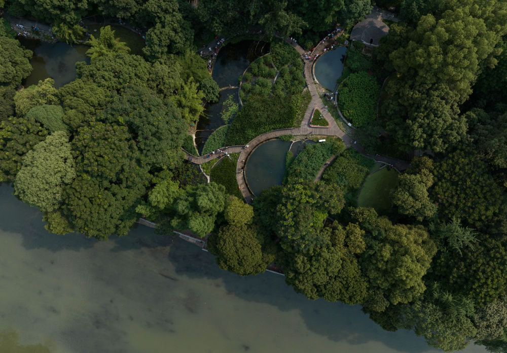 ↑这是俯瞰活水公园的人工湿地塘床生态系统(2023年6月23日摄,无人机照片)。位于成都市府河边的活水公园,集水环境、水净化、水教育于一体。新华社记者 江宏景 摄