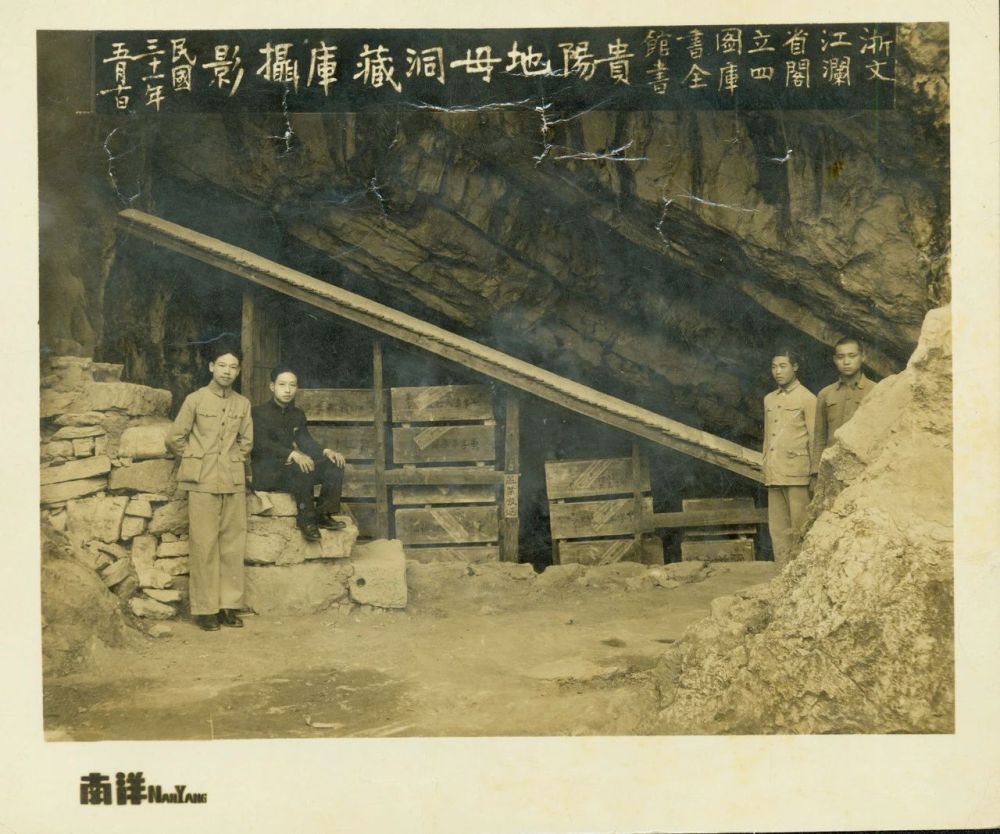 2001年,浙江图书馆古籍部工作人员张群开始管理浙图古籍善本特藏库房,文澜阁本《四库全书》保藏在其中。她偶然在库房的旧档案里发现了一张老照片:4名着中山装的工作人员在山洞前合影,背景是洞中排列整齐的书箱,照片上写着“浙江省立图书馆文澜阁四库全书贵阳地母洞藏库摄影”,时间是1942年5月10日。