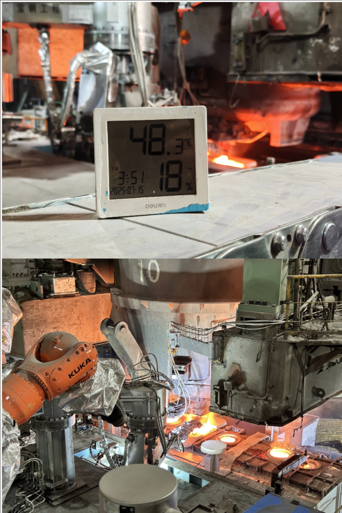 拼版照片:宝钢股份炼钢厂一炼钢工场连铸作业区实时温度48.3℃,工业机器人等设备正在作业。(受访单位供图)