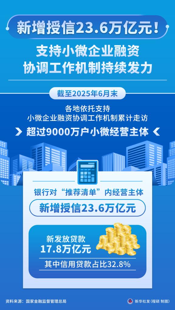 新华社北京8月1日电(记者张千千、李延霞)记者1日从国家金融监督管理总局获悉,截至2025年6月末,各地依托支持小微企业融资协调工作机制累计走访超过9000万户小微经营主体,银行对“推荐清单”内经营主体新增授信23.6万亿元,新发放贷款17.8万亿元,其中信用贷款占比32.8%。