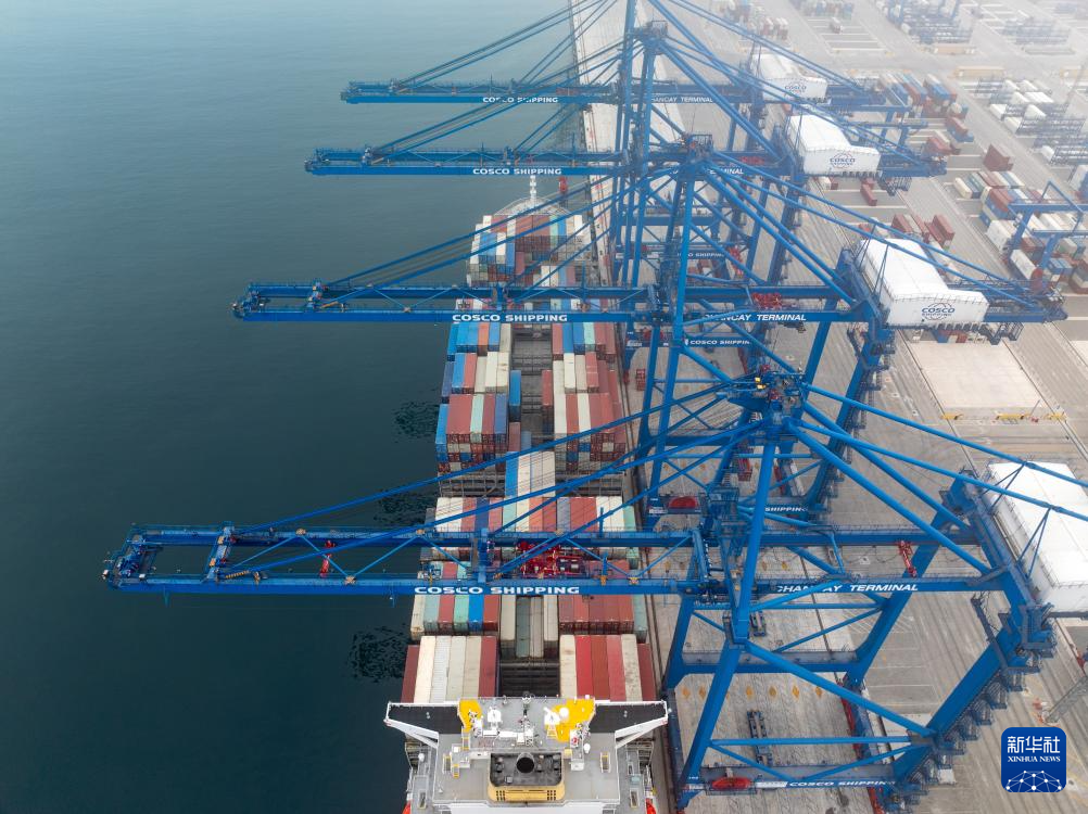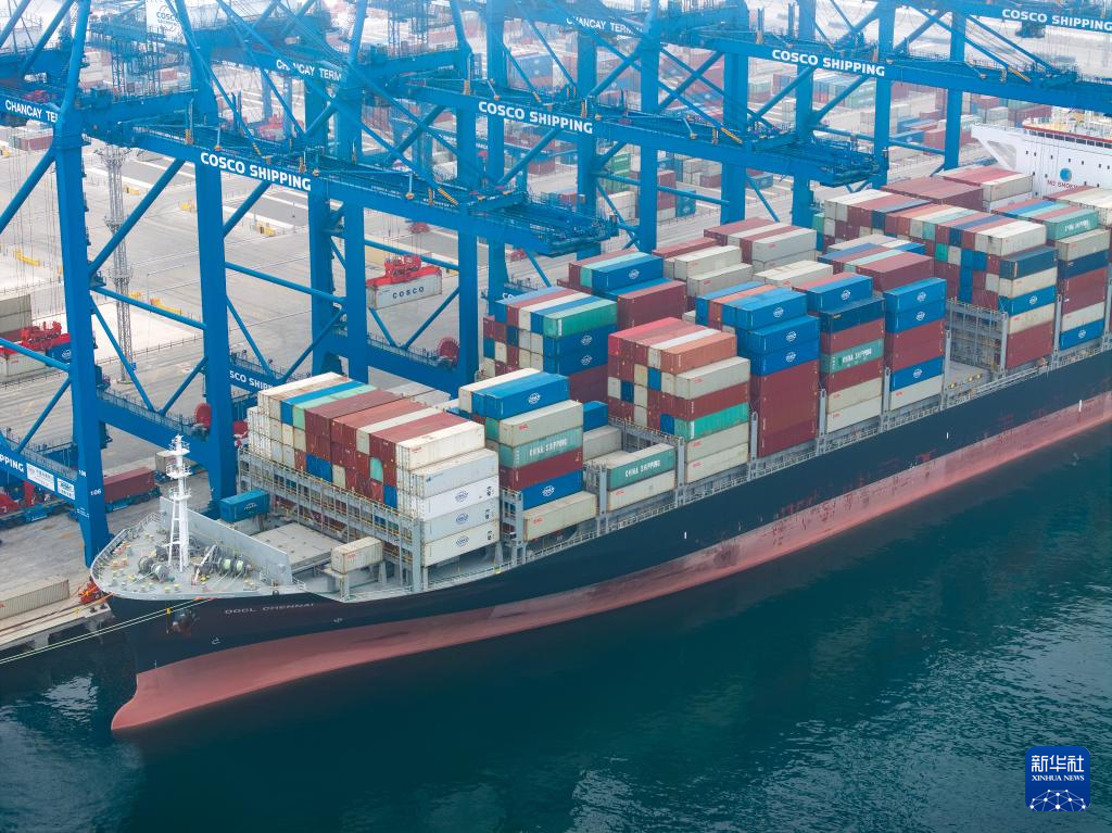 5月16日,在秘鲁钱凯港,集装箱船“金奈”轮停靠在3号泊位(无人机照片)。新华社记者 李木子 摄