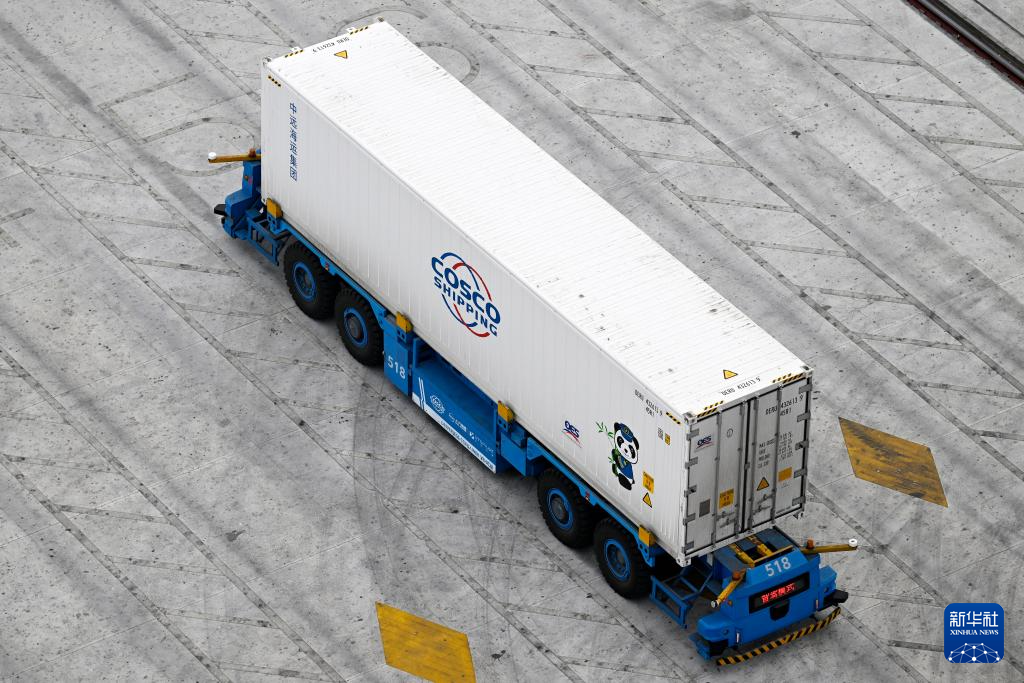 5月16日,在秘鲁钱凯港,智能驾驶集装箱卡车搬运集装箱。新华社记者 李木子 摄