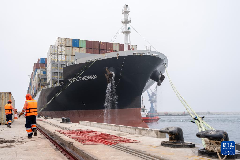 5月16日,在秘鲁钱凯港,码头工作人员对集装箱船“金奈”轮开展系泊作业。新华社记者 李木子 摄