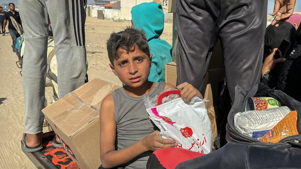 5月27日,在加沙地带南部城市拉法,一名儿童从“加沙人道主义基金会”运营的一个物资分发中心领取救援物资(手机照片)。新华社发(里泽克·阿卜杜勒贾瓦德摄)