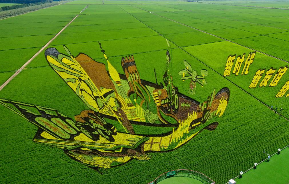 7月4日在北大荒集团友谊农场有限公司田间拍摄的稻田画(无人机照片)。新华社发(徐宏宇摄)