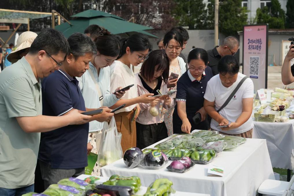 市民正在市集上通过扫描“JN码”了解蔬菜信息。新华社发