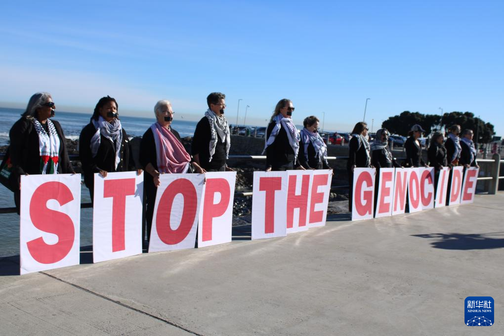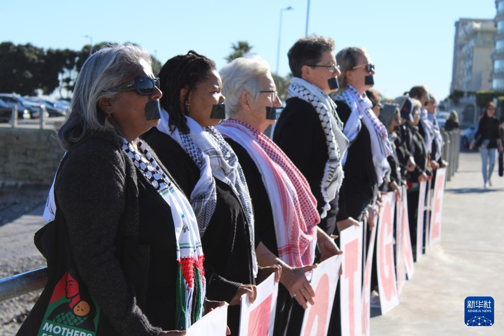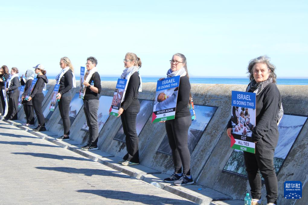 海岸边,十多位不同肤色和年龄的南非女性沿着步行道一字排开,肃然伫立。她们身着一袭黑衣,嘴上贴着黑色胶布,每人手中举着一块红色字母牌,组成了“停止种族灭绝”的字样。