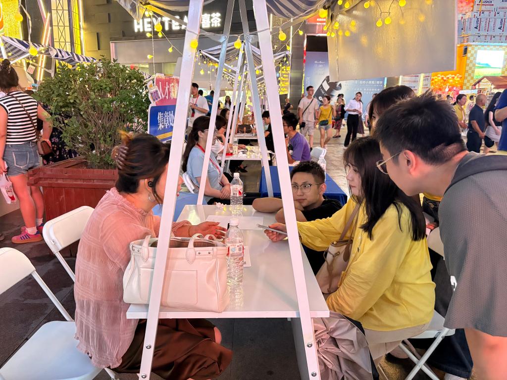 在一家电商培训公司的“摊位”前,许多年轻人围拢过来,你一言我一语,争相咨询就业问题。很快,其中一个名叫曾芳艳的女孩表明求职意愿,和“摊主”加了微信。“我是兰州城市学院的应届毕业生,在网上刷到这个招聘会,觉得很有趣,约了朋友来逛逛,感觉挺放松的。”她说。