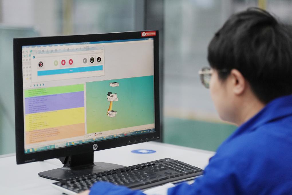 在哈尔滨电机厂有限责任公司线圈分厂智能制造车间,技术人员操作智能数控设备进行生产作业(7月24日摄)。