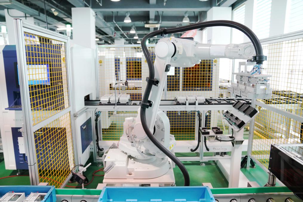 在哈尔滨汽轮机厂有限责任公司叶片分厂拍摄的中小叶片智能生产线上正在运行的机械臂(2月26日摄)。