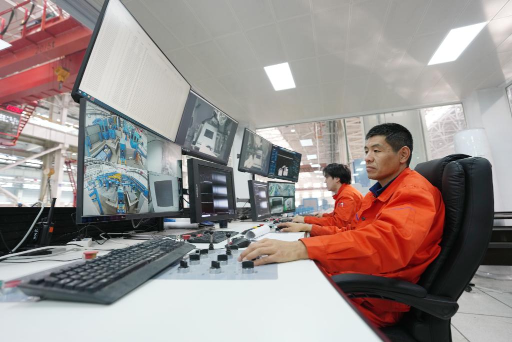 在哈尔滨锅炉厂有限责任公司管子分厂数智车间,质量检测人员使用AI智能检测对直管的对接焊口进行探伤作业(2月26日摄)。