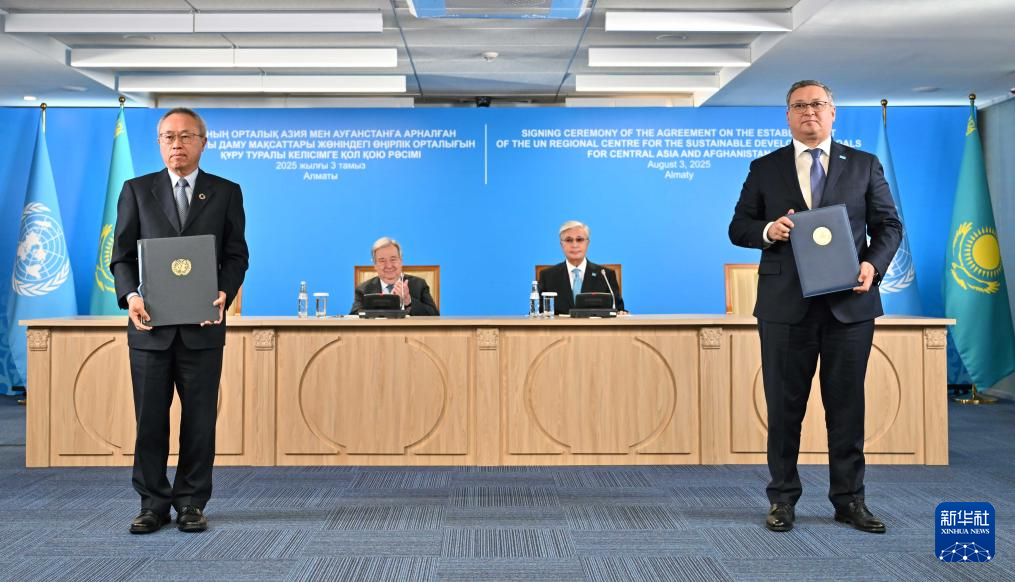 这是8月3日在哈萨克斯坦阿拉木图拍摄的联合国可持续发展目标中亚及阿富汗区域中心成立仪式。新华社发(哈总统府供图)