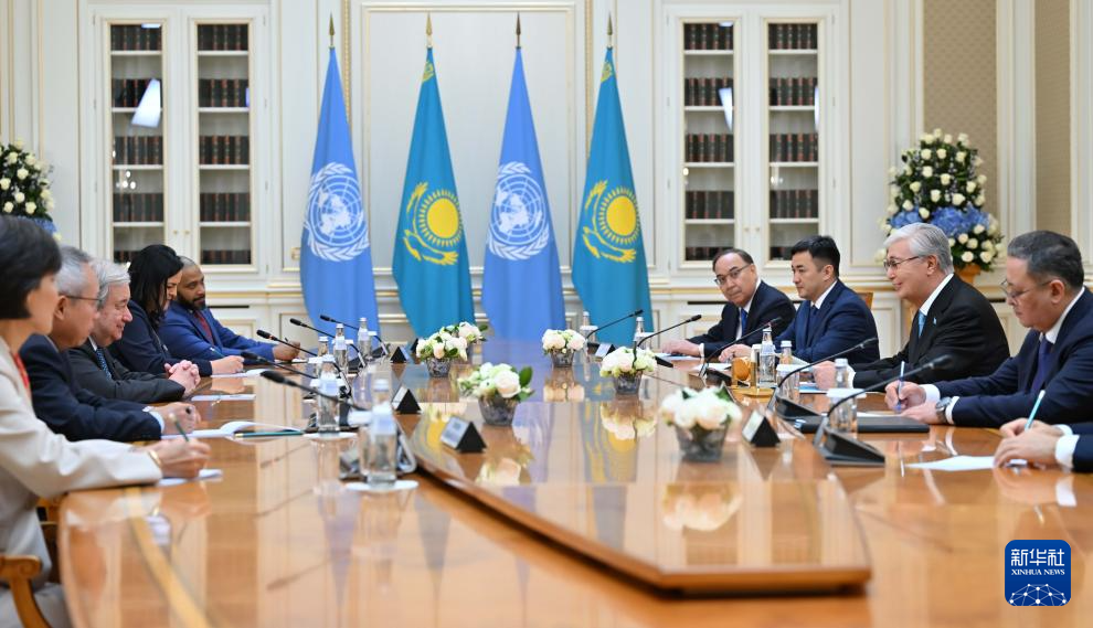 8月3日,联合国秘书长古特雷斯(左三)和哈萨克斯坦总统托卡耶夫(右二)在哈萨克斯坦阿拉木图举行会谈。新华社发(哈总统府供图)