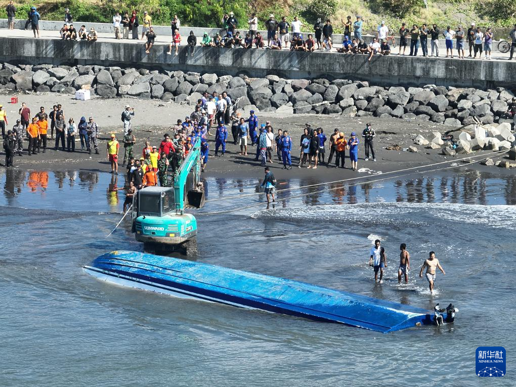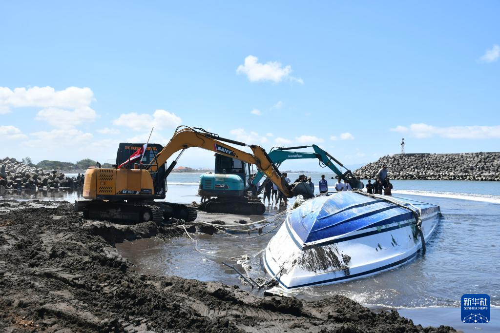 8月6日,在印度尼西亚巴厘岛,救援人员打捞“海豚2号”快艇。新华社发(印尼国家搜救局供图)