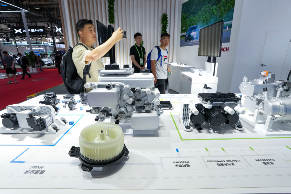7月19日,在第三届中国国际供应链促进博览会设置的智能汽车链展区博世展台,参观者在拍摄面向新能源汽车的热管理系统解决方案展示。新华社记者鞠焕宗摄