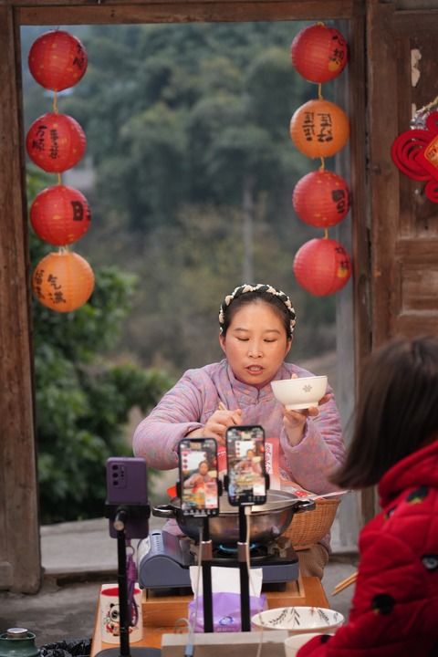 “蜀中桃子姐”在春节期间直播带货。李健学摄