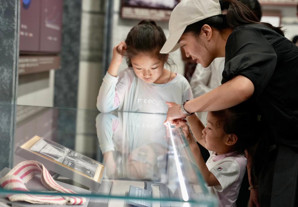 7月1日,一名家长带着两个女儿在位于上海的中共一大纪念馆内参观。新华社记者 刘颖 摄