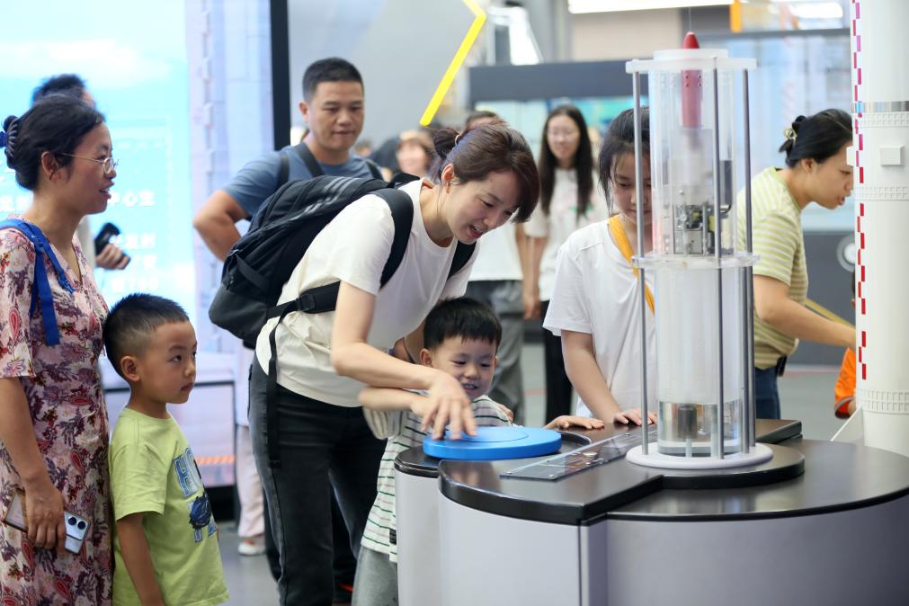 7月5日,家长带着孩子在四川科技馆体验科普设备。新华社发(李华时 摄)