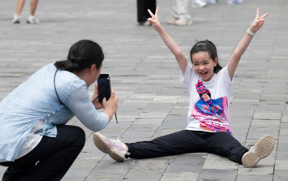 8月5日,家长在位于北京的天坛公园给孩子拍照。新华社记者 张涛 摄