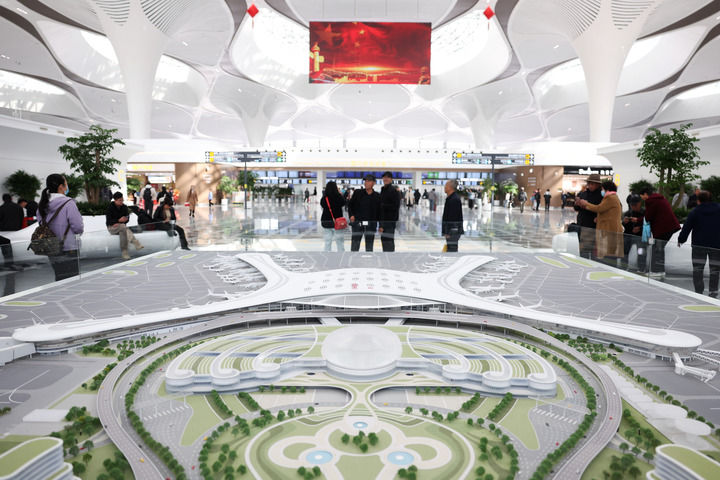 这是3月20日摄在兰州中川国际机场T3航站楼出发大厅拍摄的T3航站楼和综合交通中心沙盘模型。当日,兰州中川国际机场T3航站楼正式启用。新华社记者 陈斌 摄